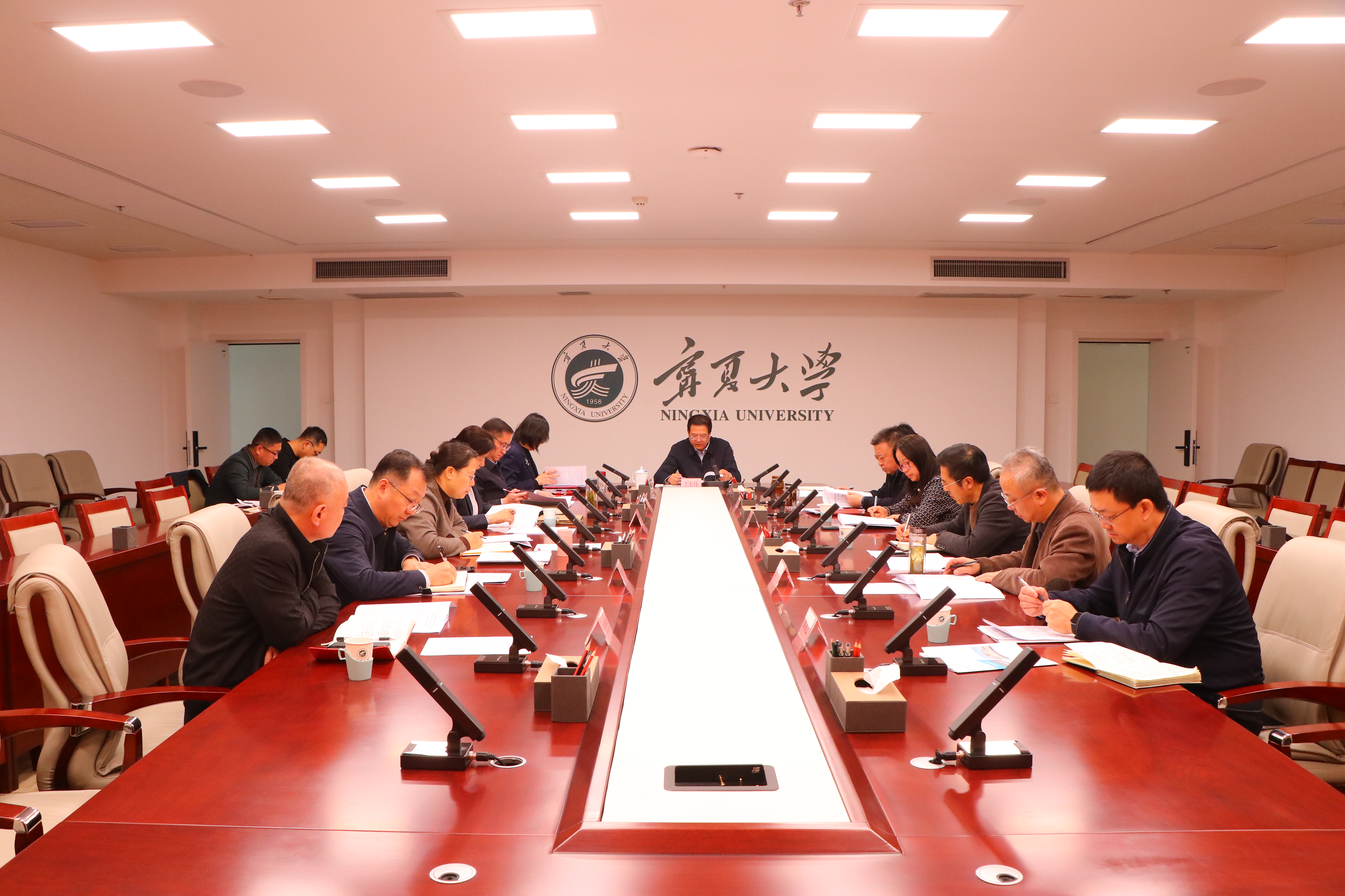 【宁夏大学新闻中心讯 杨雯/文、图】11月27日,校党委理论学习中心组2025年第12次学习会在德勤楼召开,专题学习习近平法治思想、习近平经济思想,传达学习中央全面依法治国工作会议精神和教育部全国高校依法治校工作会议精神,彭志科等6位同志围绕学习贯彻《习近平谈治国理政》第五卷开展研讨交流。校党委书记王宏伟主持会议,校党委理论学习中心组成员参加学习会。