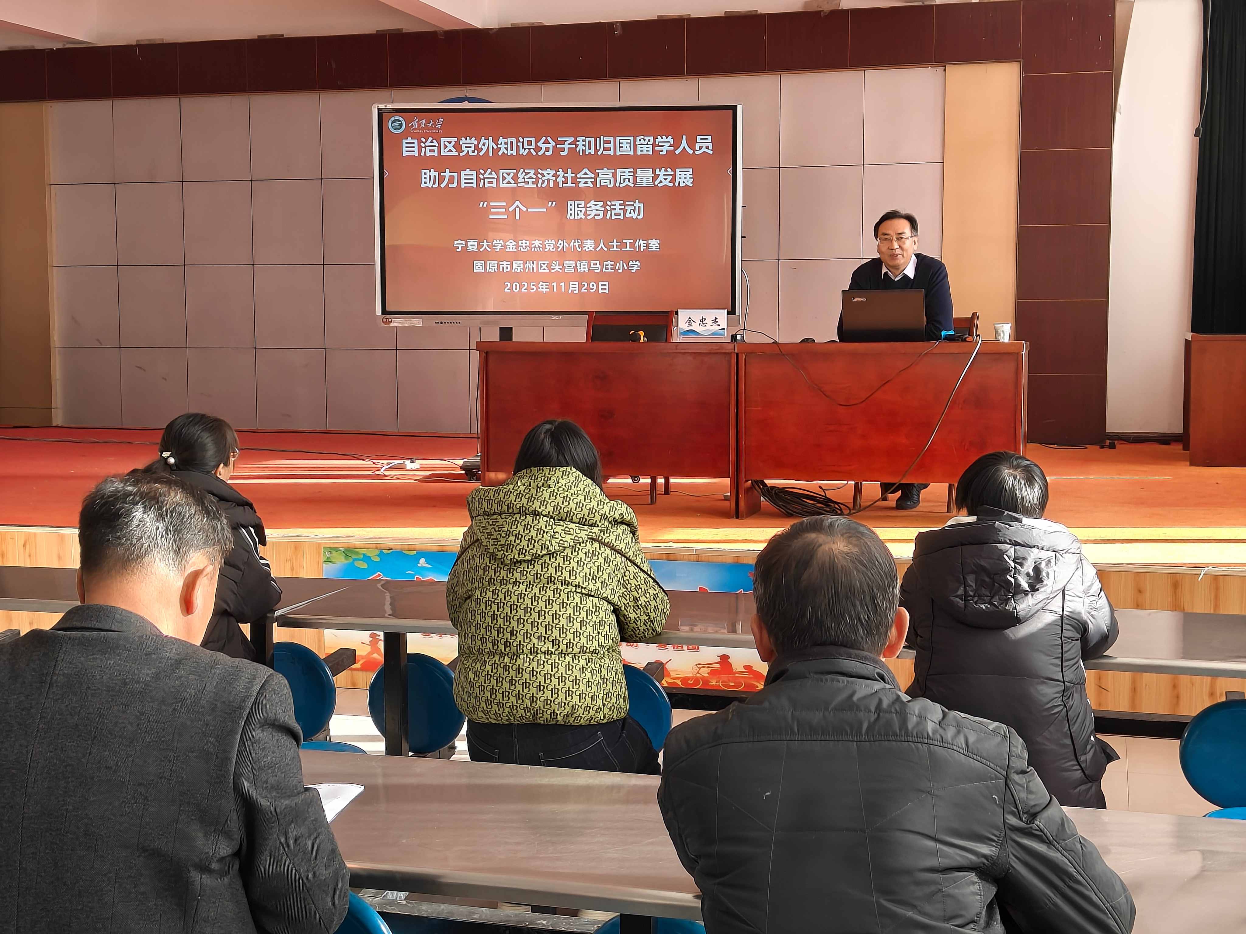 工作会前,宁夏大学金忠杰党外代表人士工作室在马庄小学举行了自治区党外知识分子和归国留学人员助力自治区经济社会高质量发展“三个一”服务活动。自治区政协常委、宁夏大学外国语学院副院长金忠杰教授围绕“铸牢中华民族共同体意识示范区建设与新时代中国式现代化宁夏篇章”,为头营镇部分学校教师作了专题讲座。