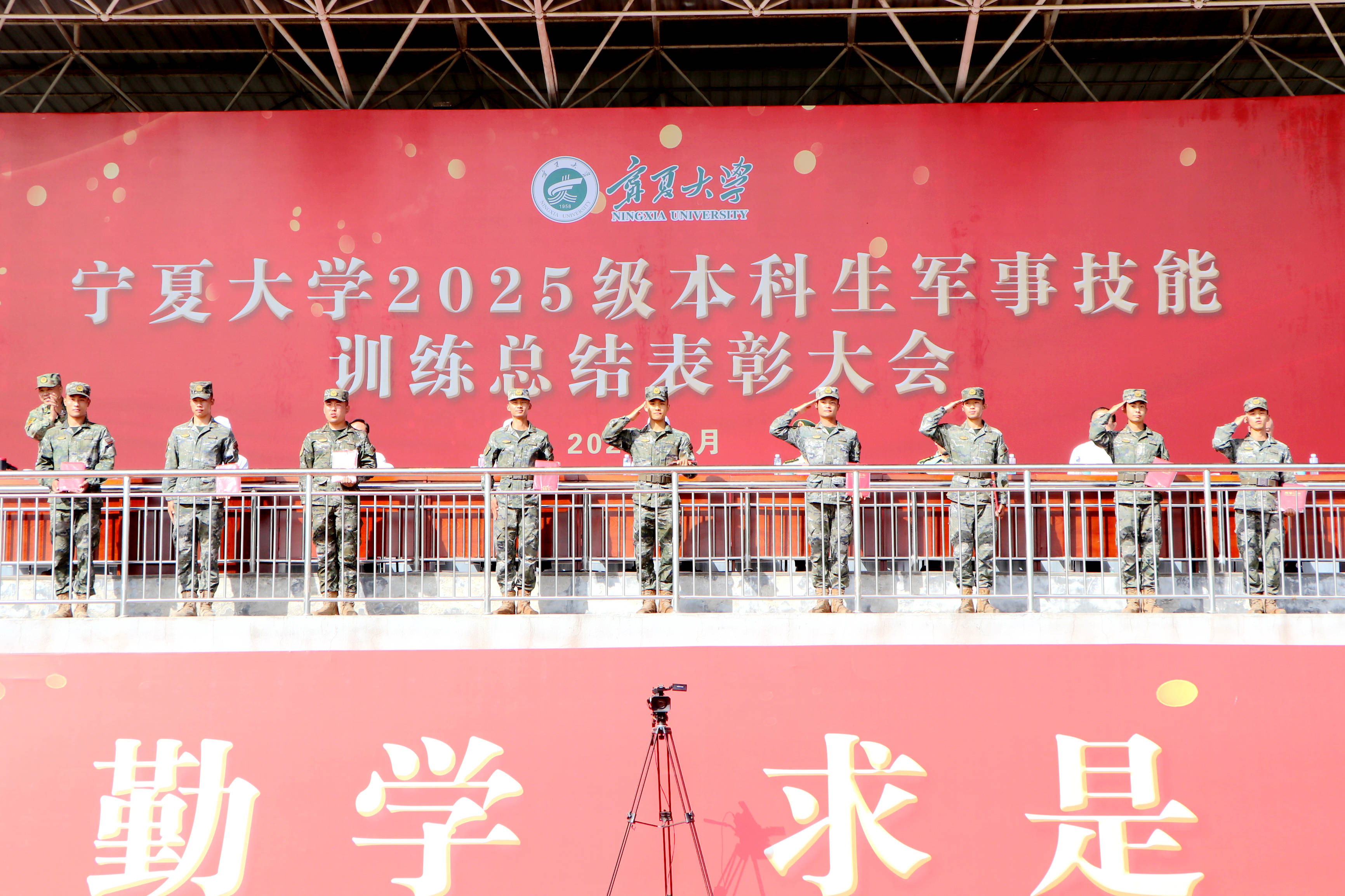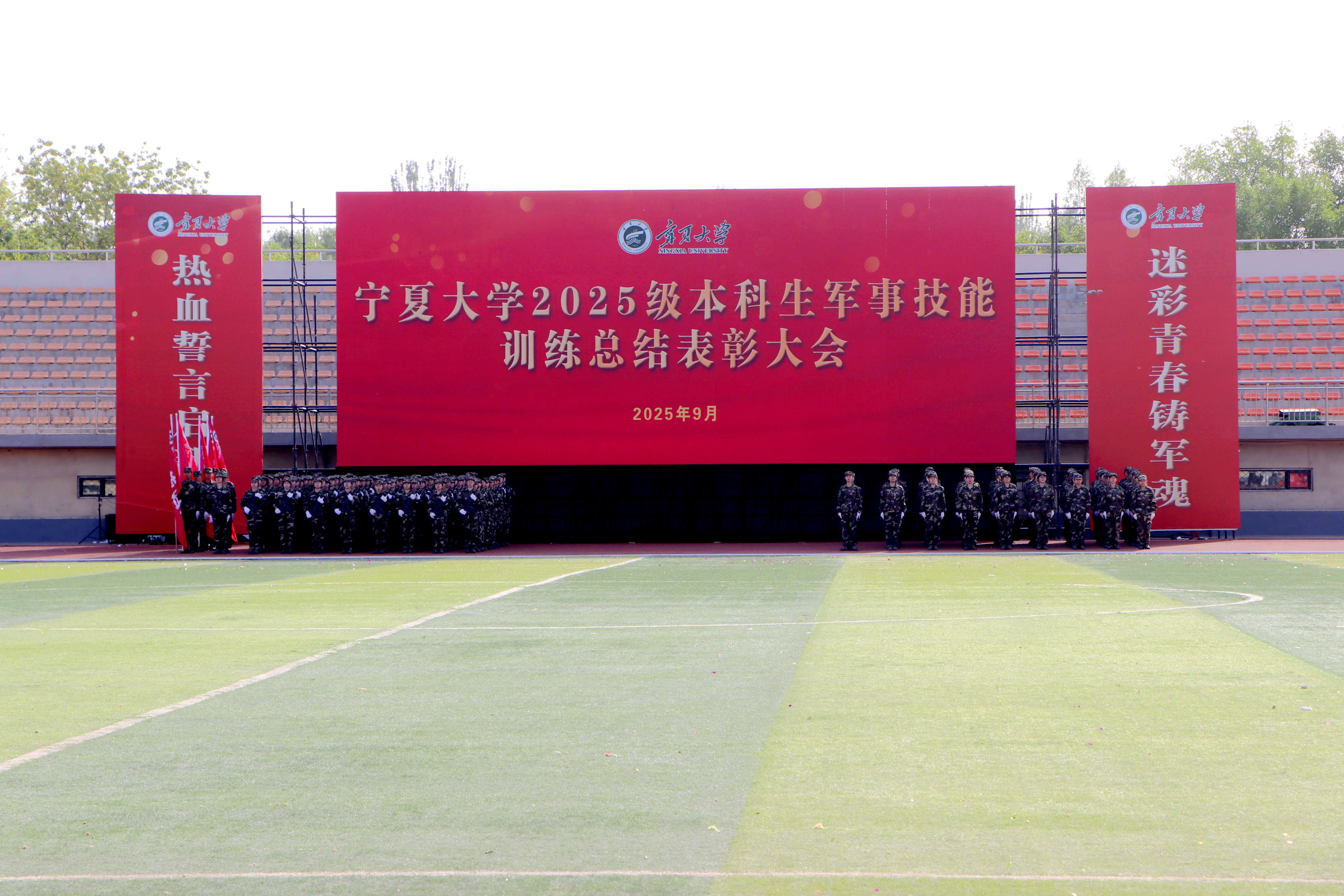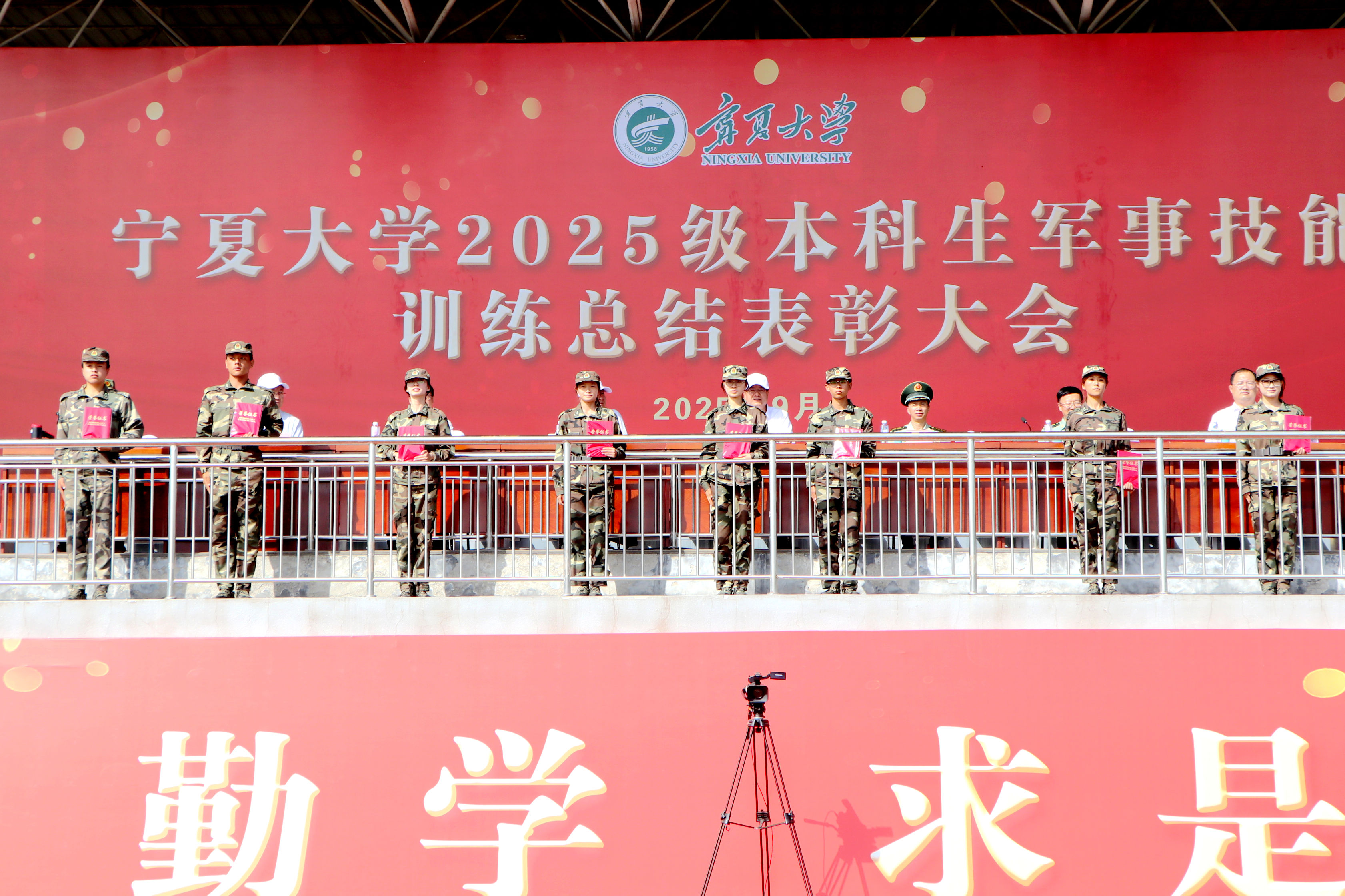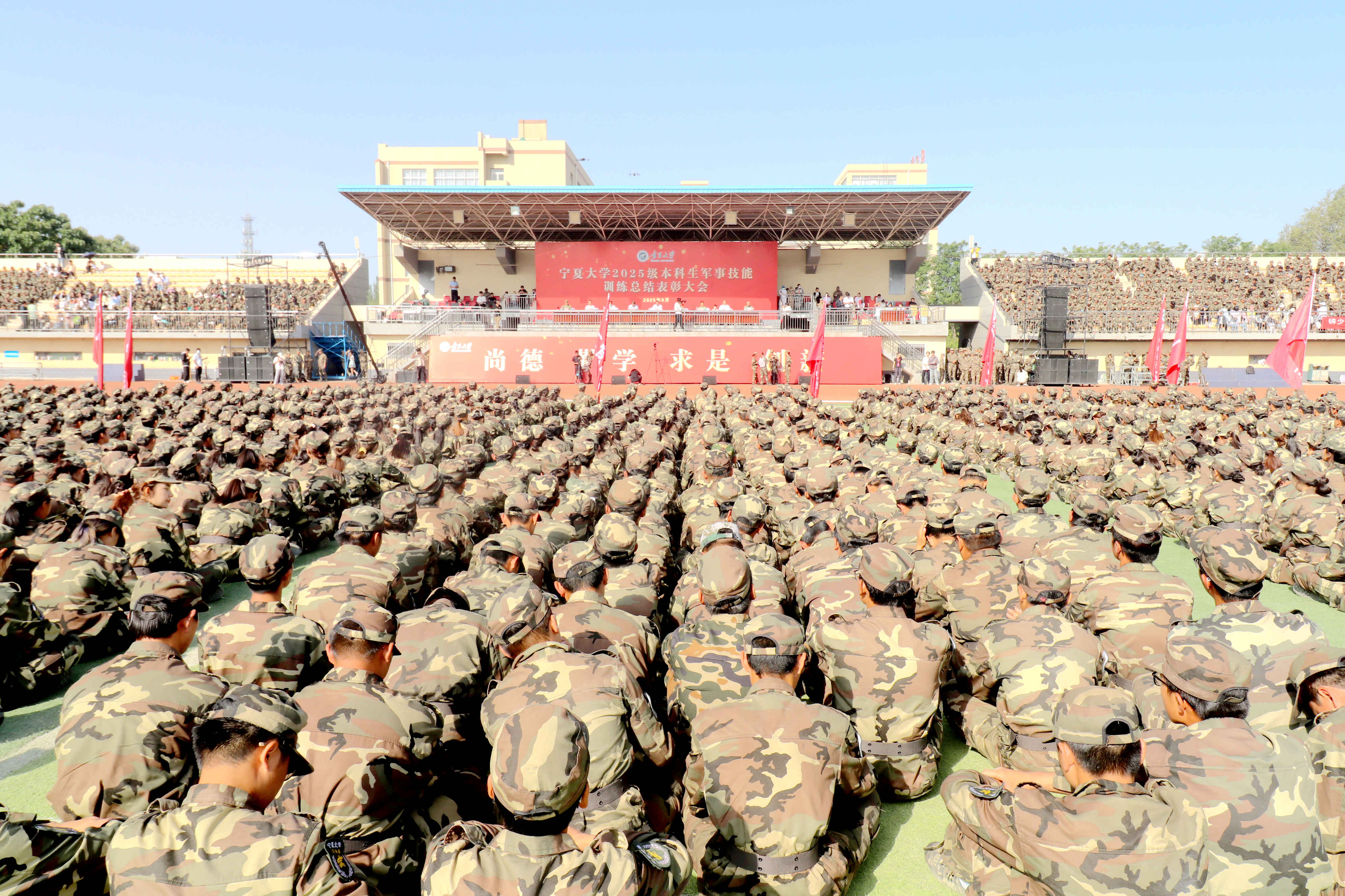 【宁夏大学新闻中心讯 李瑾/文 张景/图】9月14日,在宁夏大学建校67周年生日前夕,学校在怀远校区田径场隆重举行2025级本科生军事技能训练总结表彰大会。校领导王宏伟、黄河、马元、杨文法,武警银川某部相关领导,自治区教育厅体卫艺处二级调研员马希林,宁夏大学办公室主任冯学文出席大会。校党委学生工作部(学生处)部(处)长、军训团政委马正亮主持大会。