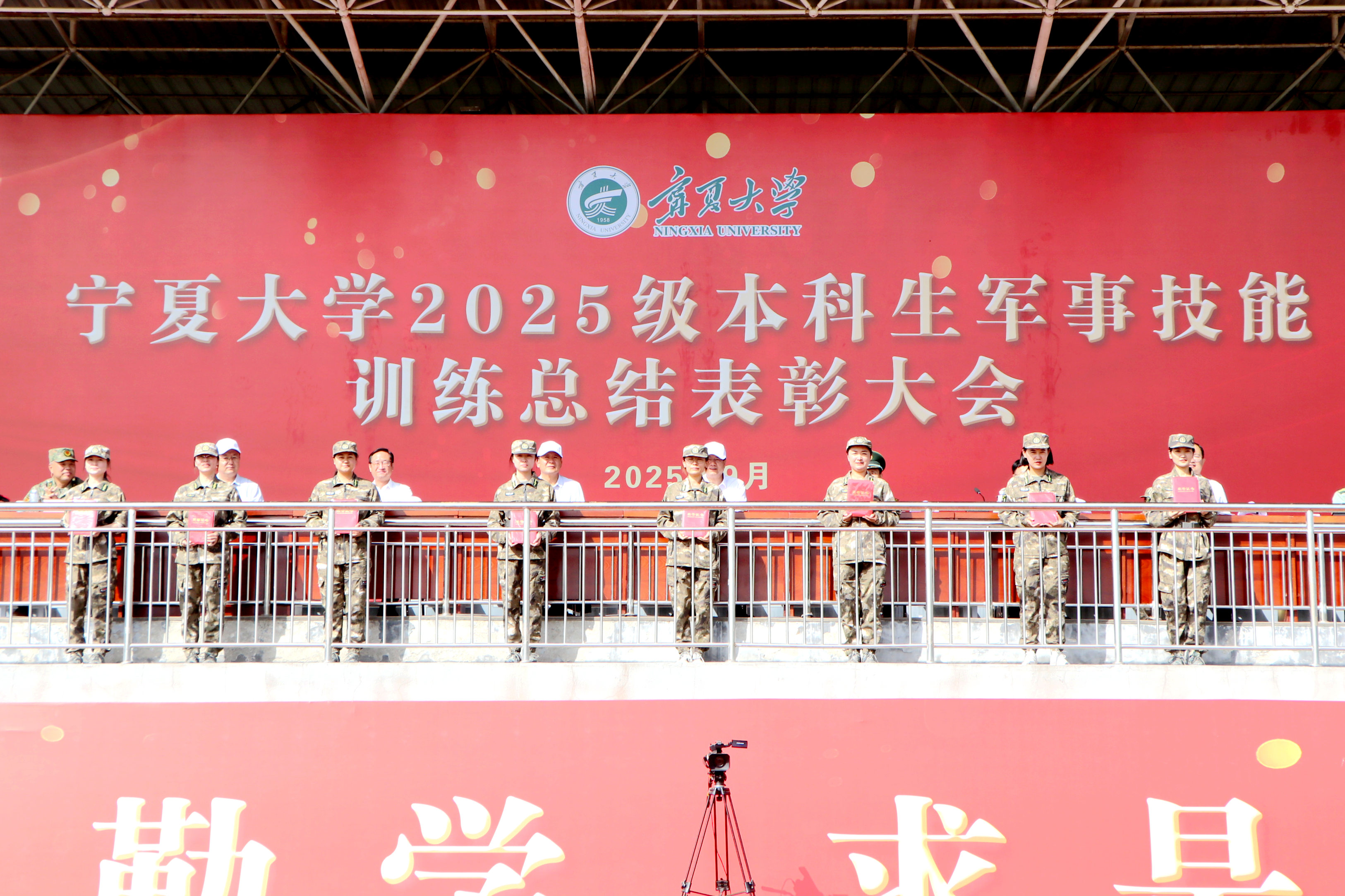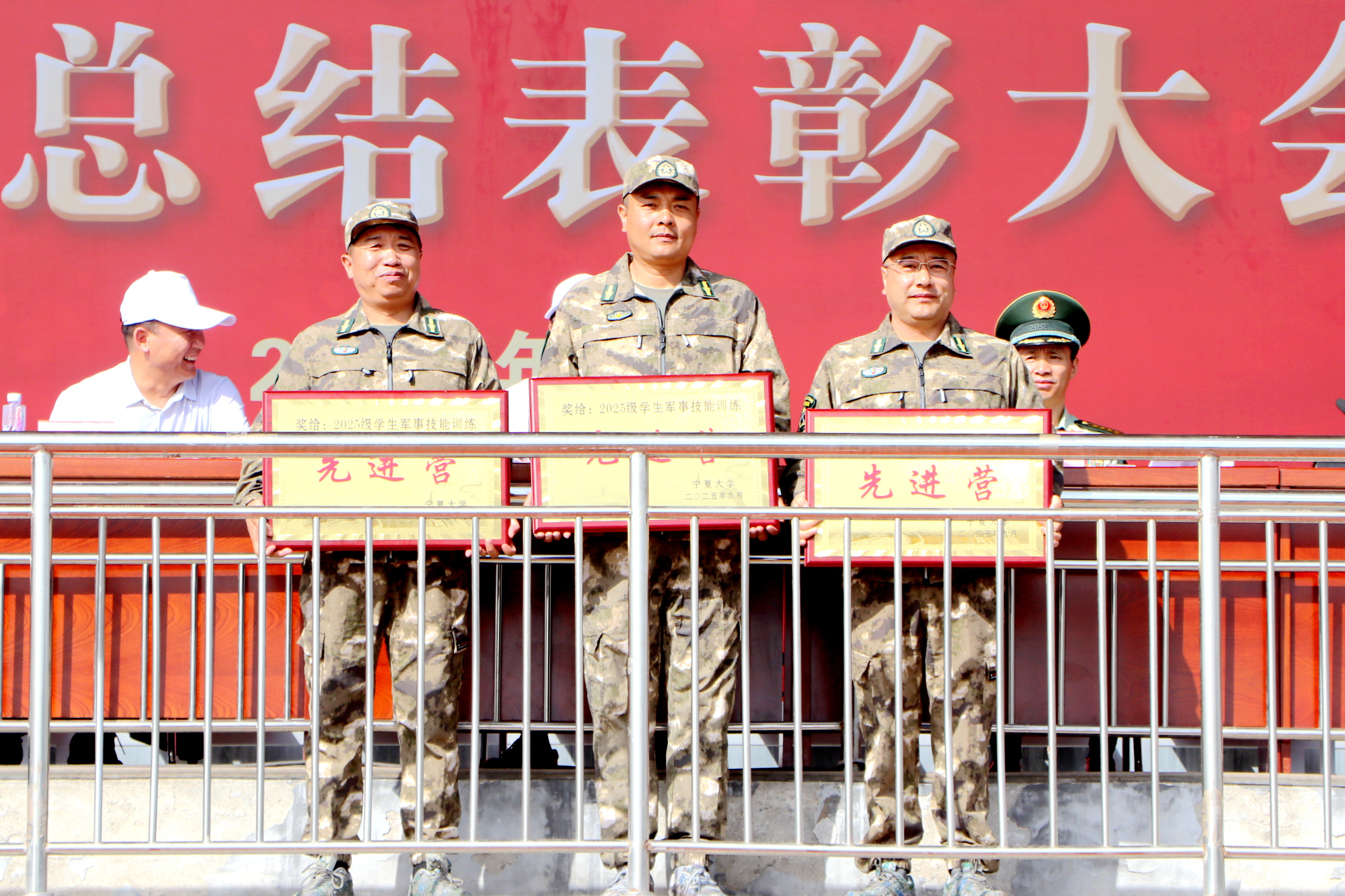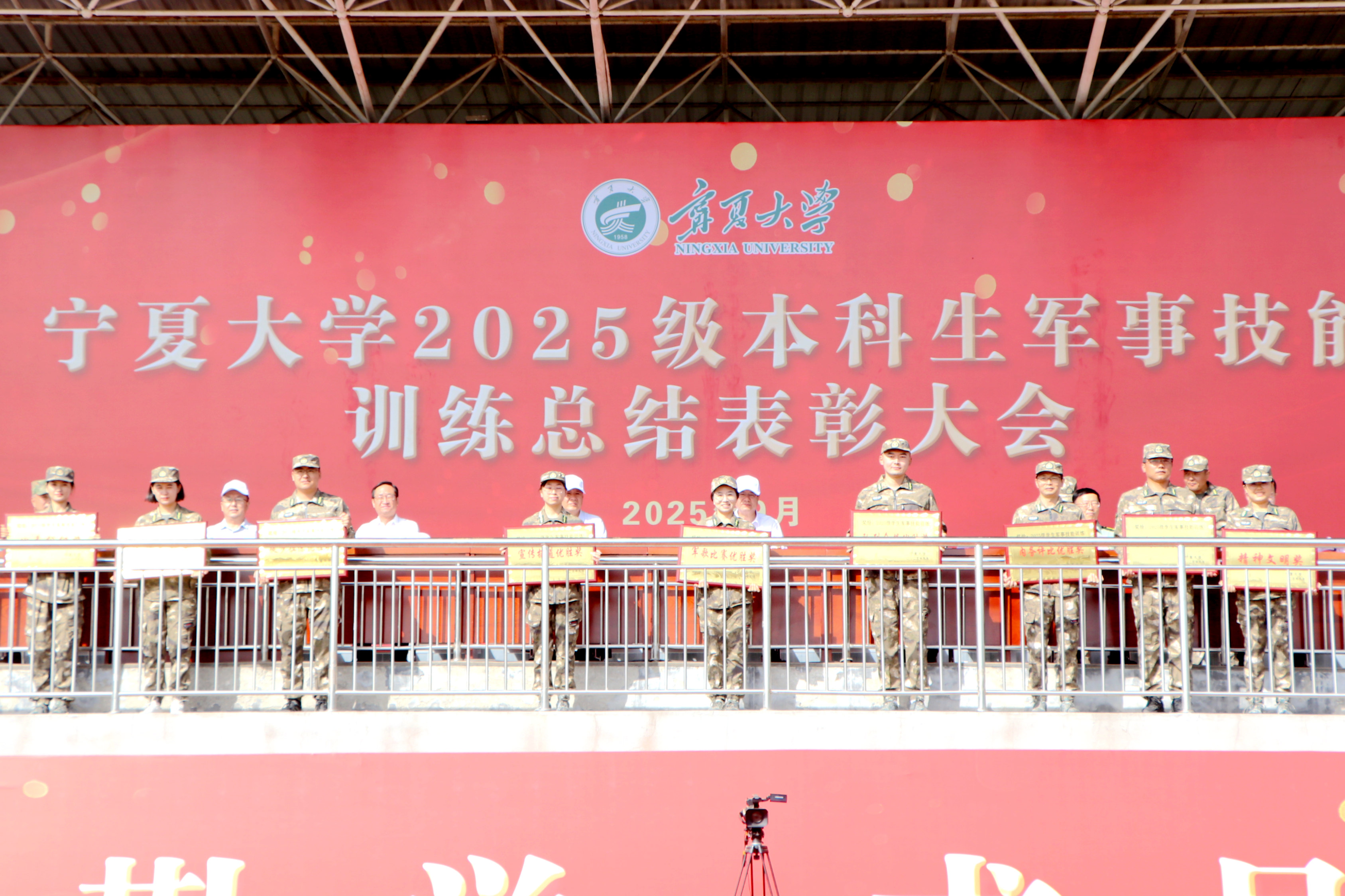 总结表彰大会在全体师生官兵齐唱中华人民共和国国歌中开始。校党委常委、副校长杨文法宣读《宁夏大学2025级本科生军训工作先进单位及先进个人表彰决定》。主席台领导先后为获得军训先进营、单项奖、优秀组织奖、精神文明奖和先进连的单位,获得“军训优秀教师”“军训优秀学生”和“军训优秀教官”的个人代表颁奖。