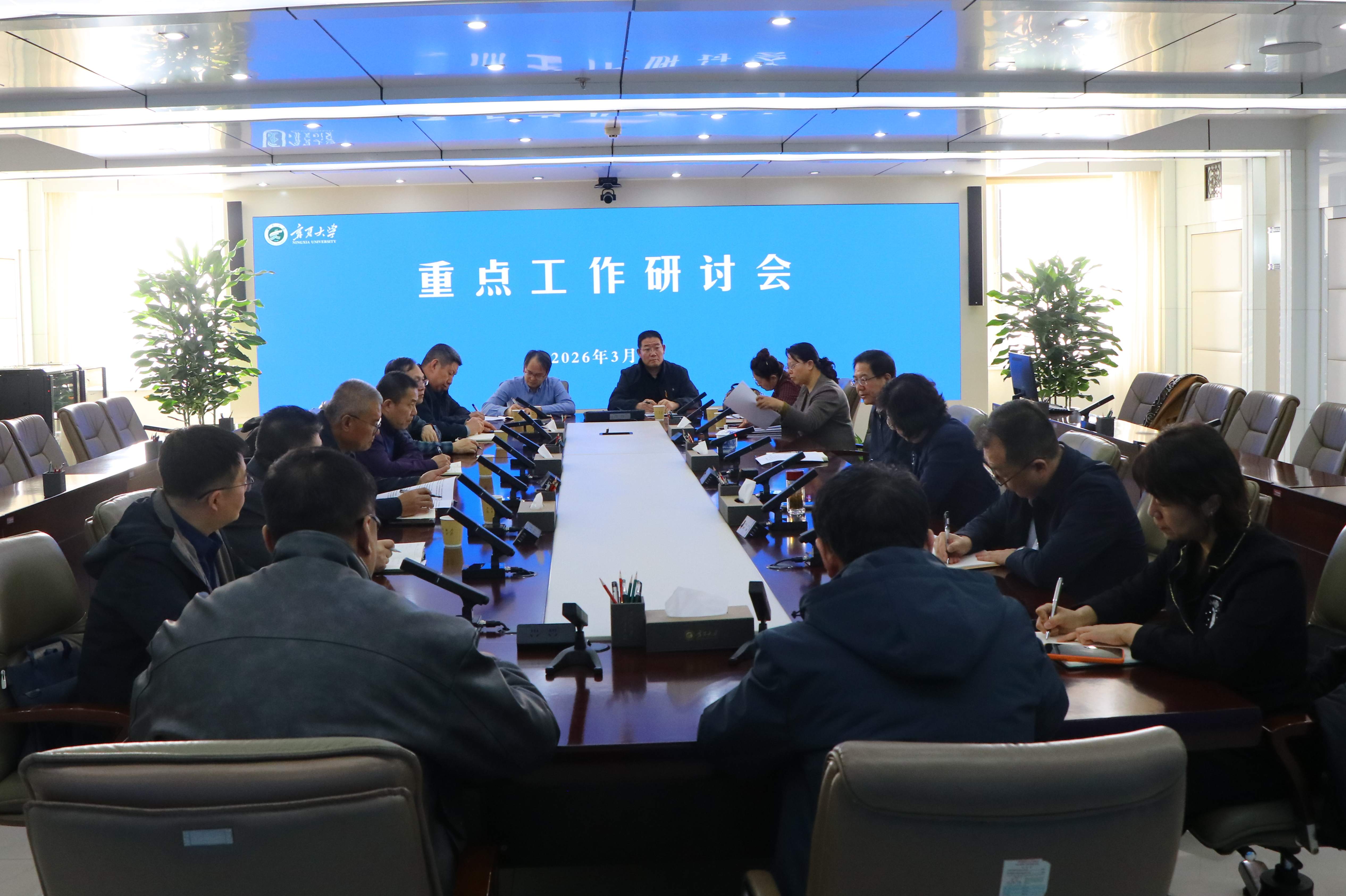 【宁夏大学新闻中心讯 姬晓姗/文、图】2026年是“十五五”开局之年,为进一步明确今年重点工作任务,统一思想、凝聚共识,3月3日至6日,校党委书记王宏伟在德勤楼十一楼会议室分别主持召开8场重点工作会商会,与校领导韩惠丽、张桓、黄河、马元、赵晓佳、冯秀芳、杨文法、车进及其分管(联系)部门(单位)主要负责人面对面会商,围绕学校2026年工作要点、树立和践行正确政绩观学习教育、校园安全稳定、就业工作、“十五五”规划编制等核心议题进行研讨,确保新学期各项工作有序开展。